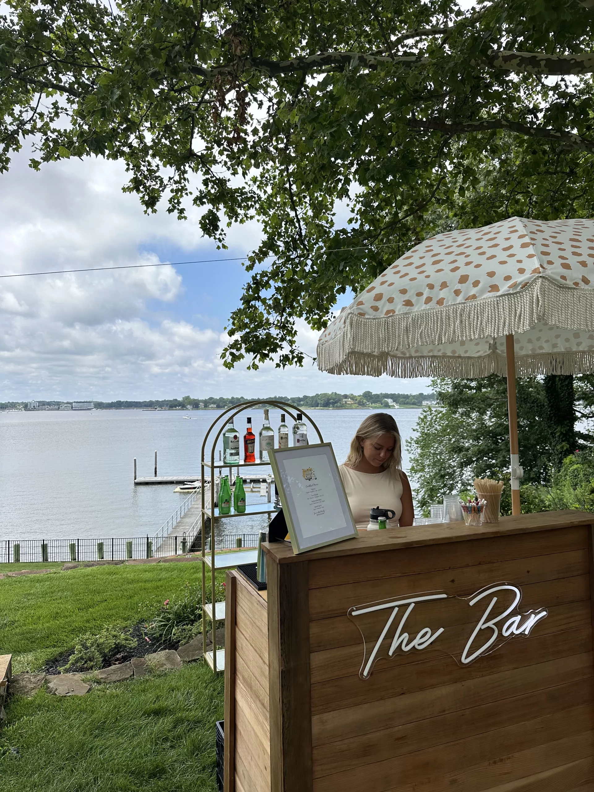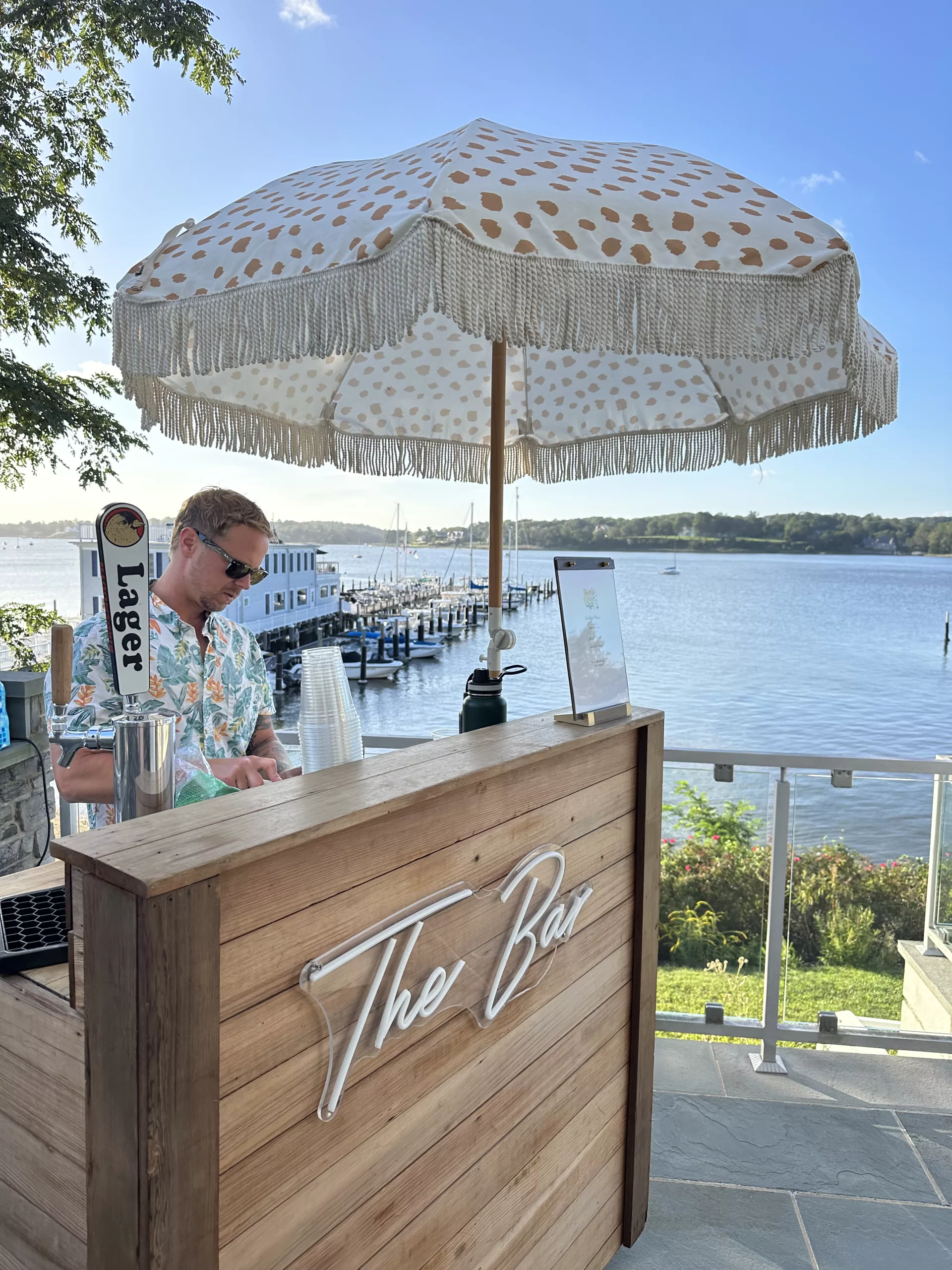 The Clark Griswold Bar doesn’t just show up, it arrives in a blaze of warm white Christmas lights, glowing garland, and rich wood that feels like it was pulled straight from Santa’s workshop. The custom wood top gleams beneath twinkling strands of holiday magic, wrapped so generously in lights it feels like the entire spirit of the season is humming through it.